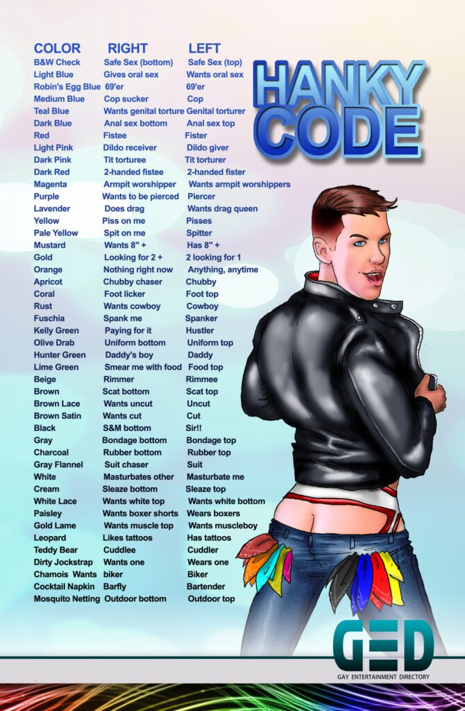 Coloured handkerchiefs worn in the back pocket use to be a shorthand for sexual preferences, known as “flagging.” Worn on the left, they use to indicate that the wearer plays the active role, and on the right, the passive role.
